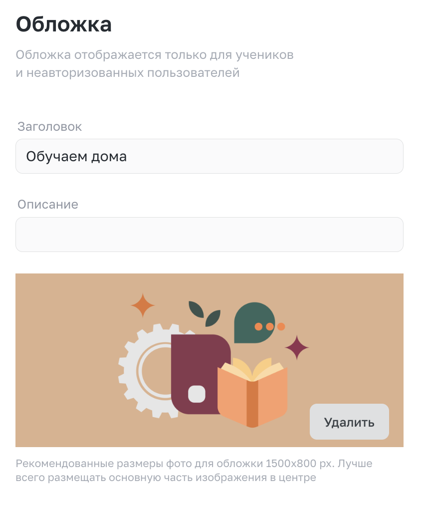 При нажатии на изображение откроется окно выбора для загрузки новой обложки. При наведении курсора на загруженное изображение, в правом нижнем углу появляется кнопка «Удалить». После удаления вместо обложки будет отображаться черный фон.